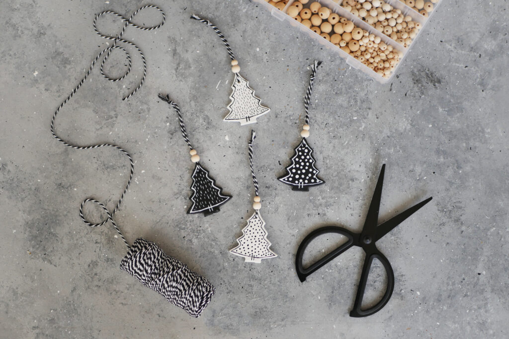 Wenn die Farbe trocken ist, kannst du die Anhänger auffädeln. Ich habe hierfür schwarz weißes Bäckergarn* verwendet, weil es perfekt zum Stil der Bäume passt. Vor dem Verknoten habe ich noch zwei verschieden große Holzperlen* aufgefädelt.